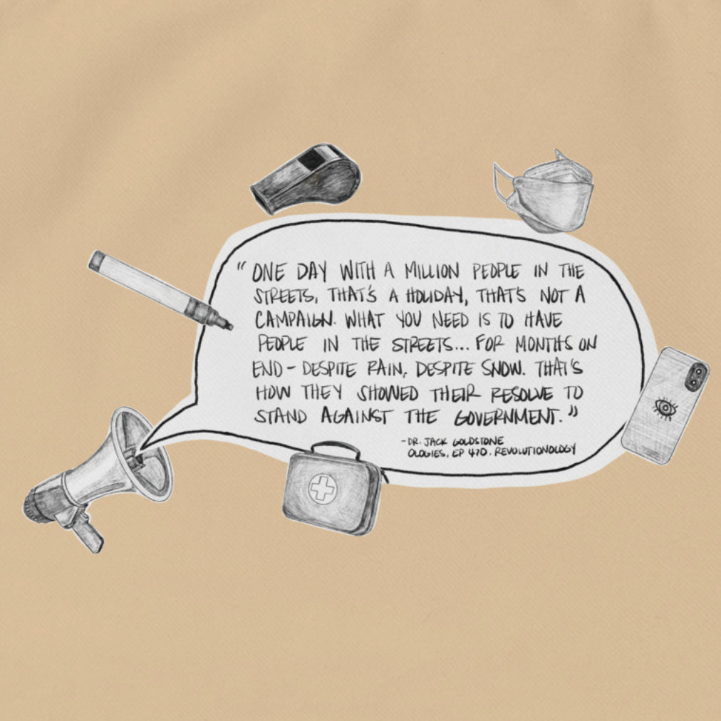 2026 new merch alert! To keep you inspired and vocal in support of human rights, we collaborated with artist, author, and Los Angeles County public defender Andrea Diaz. Whistles, markers, megaphones, cameras documenting ICE raids and other human rights abuses, first aid kits, and masking up against crowd dispersal have become vital tools during protest work. These icons of resistance surround a passage from our Revolutionology episode with scholar Dr. Jack Goldstone. Proceeds from this merch benefit the cause of Andrea's choosing: The National Immigration Law Center, which advances laws and policies that center human dignity and benefit us all: a health care and safety net system that allows everyone to thrive; labor laws that empower all workers to fulfill their potential; and federal policies that recognize migration as a global phenomenon that transforms societies for the better. The National Immigration Law Center fights for a society where everyone has the freedom to thrive, no matter how much money we have, what we look like, or where we were born, and they work at the intersection of immigrant, economic, gender, and racial justice.